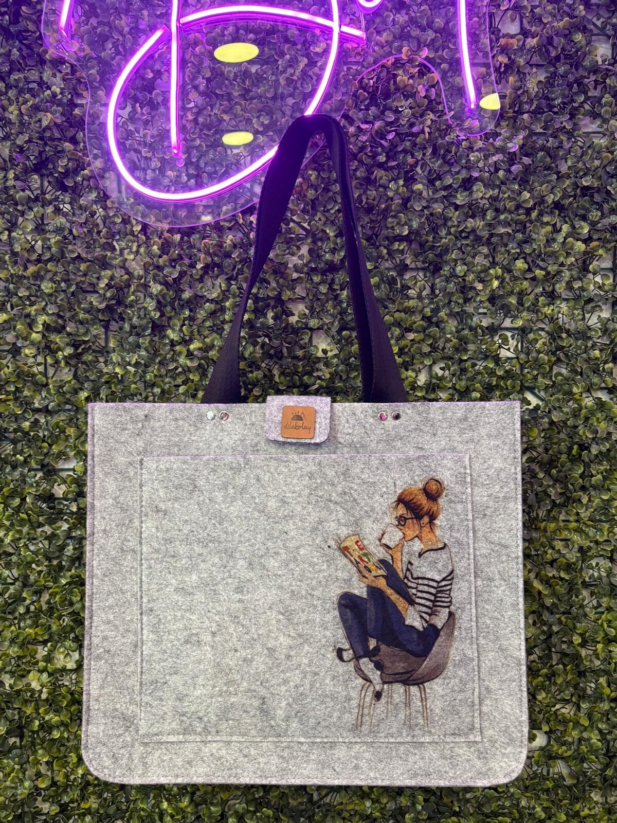 -Kahve İçen Kız Baskılı Keçe Çantamız Büyük Boy