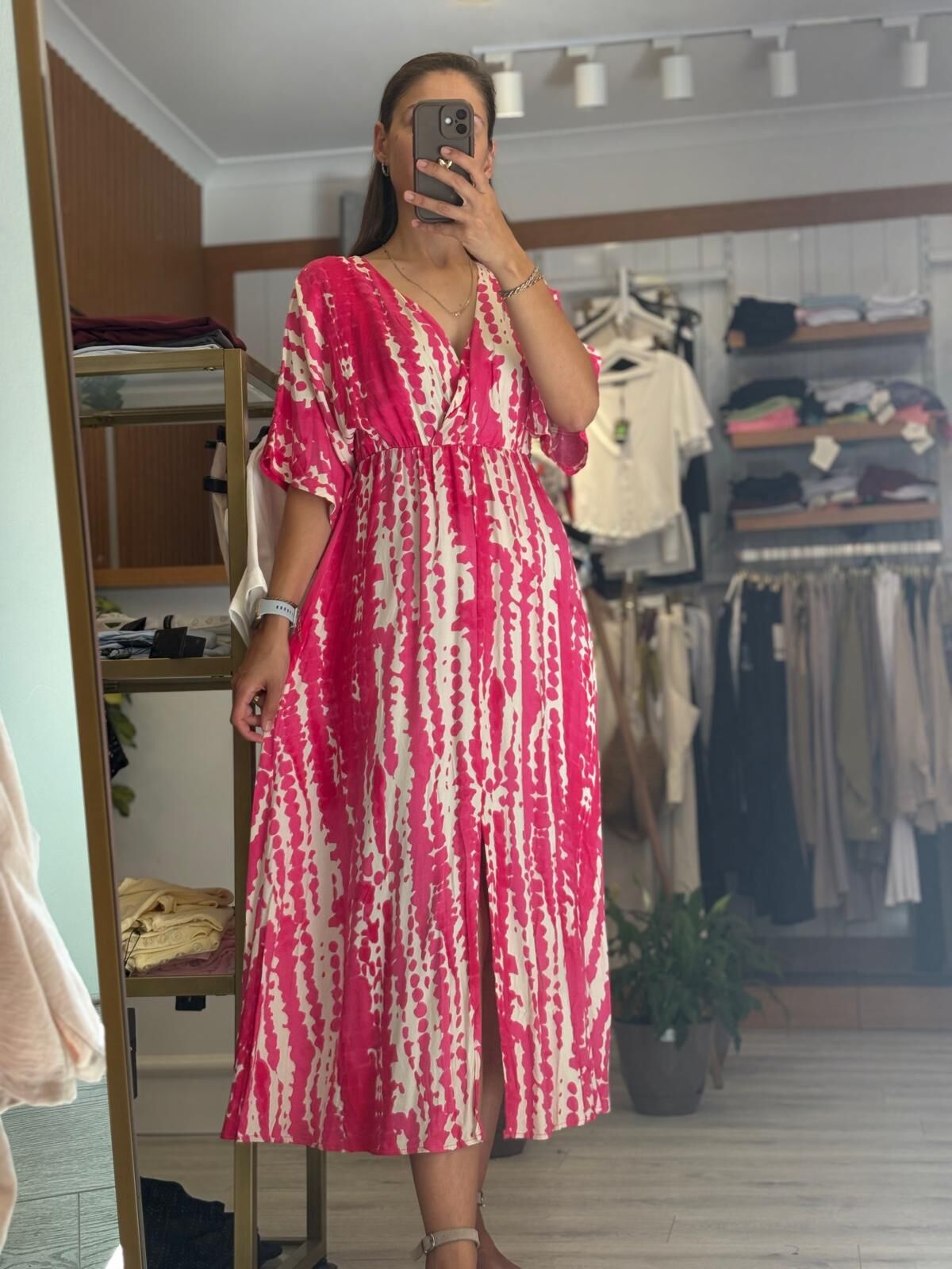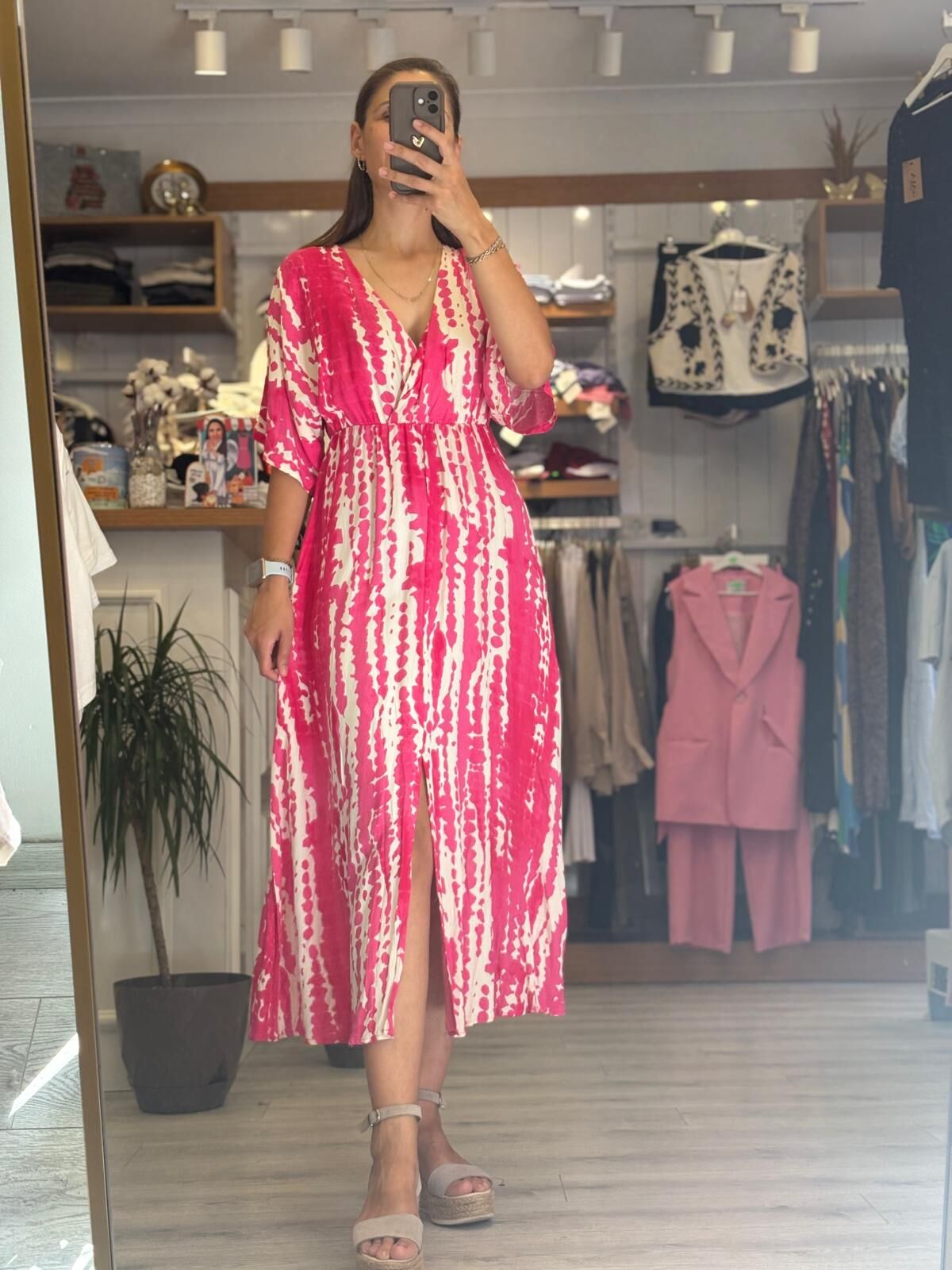 Nokta Detaylı Pembe Kruvaze Yarasa Kol Elbise