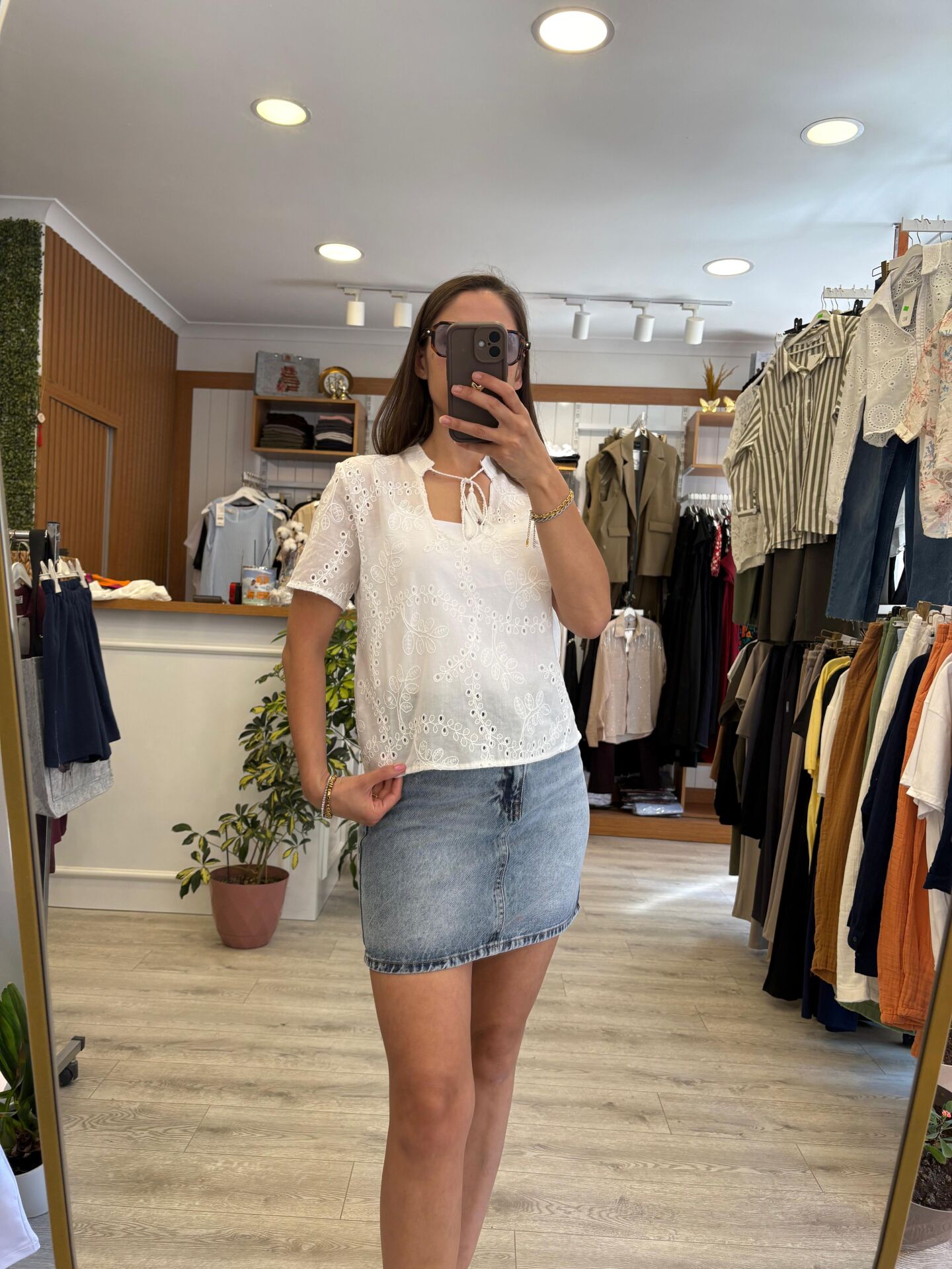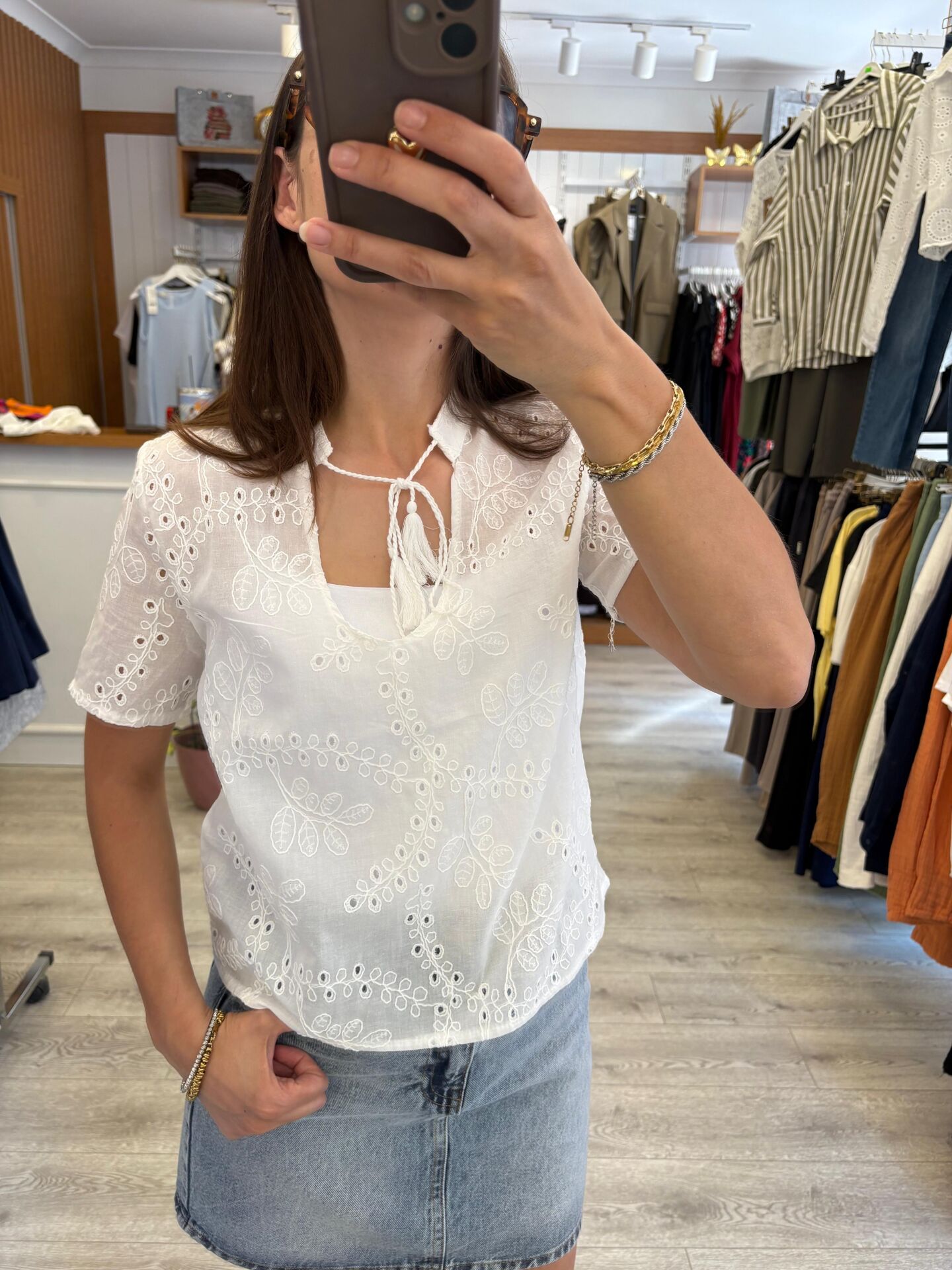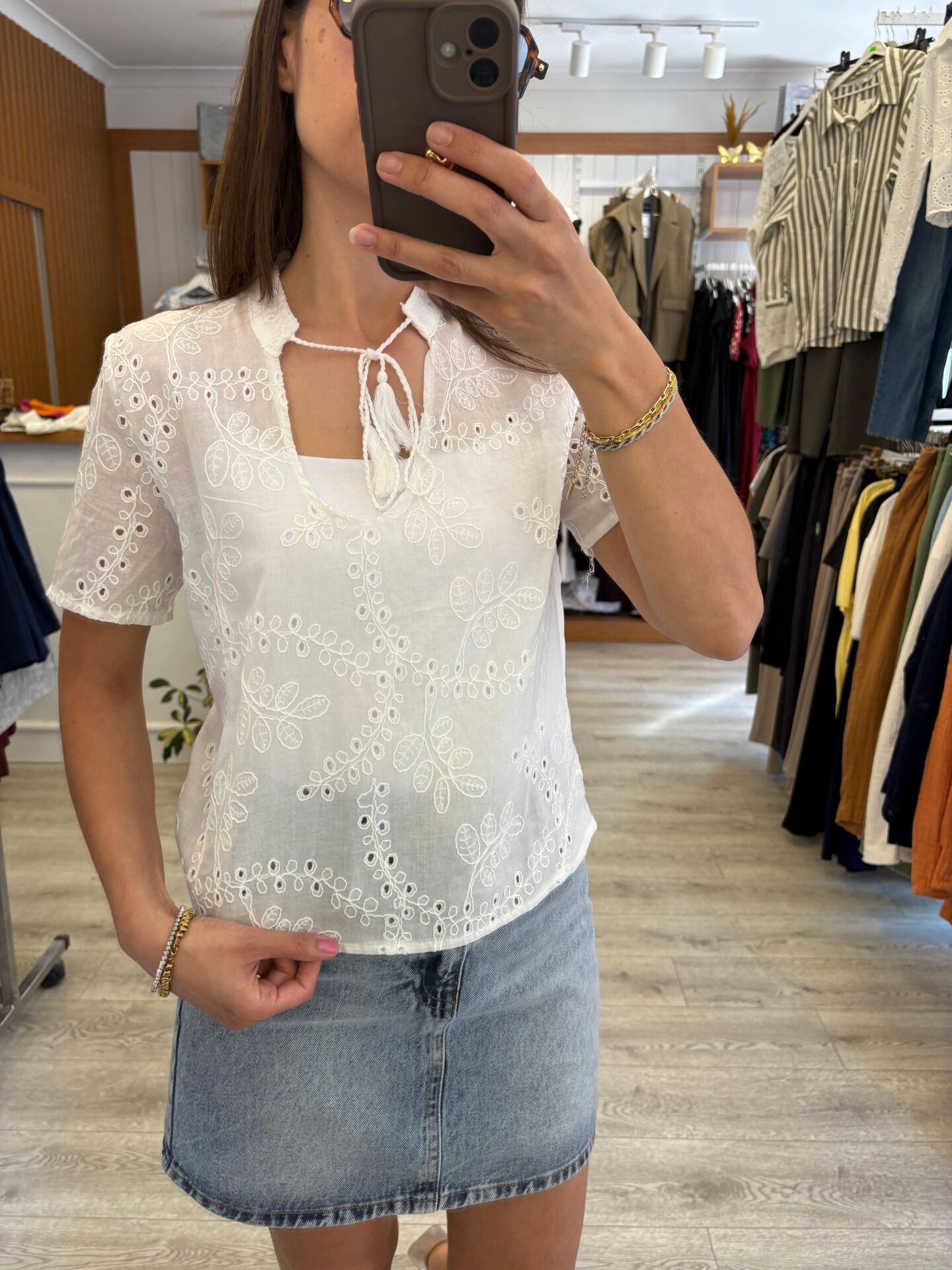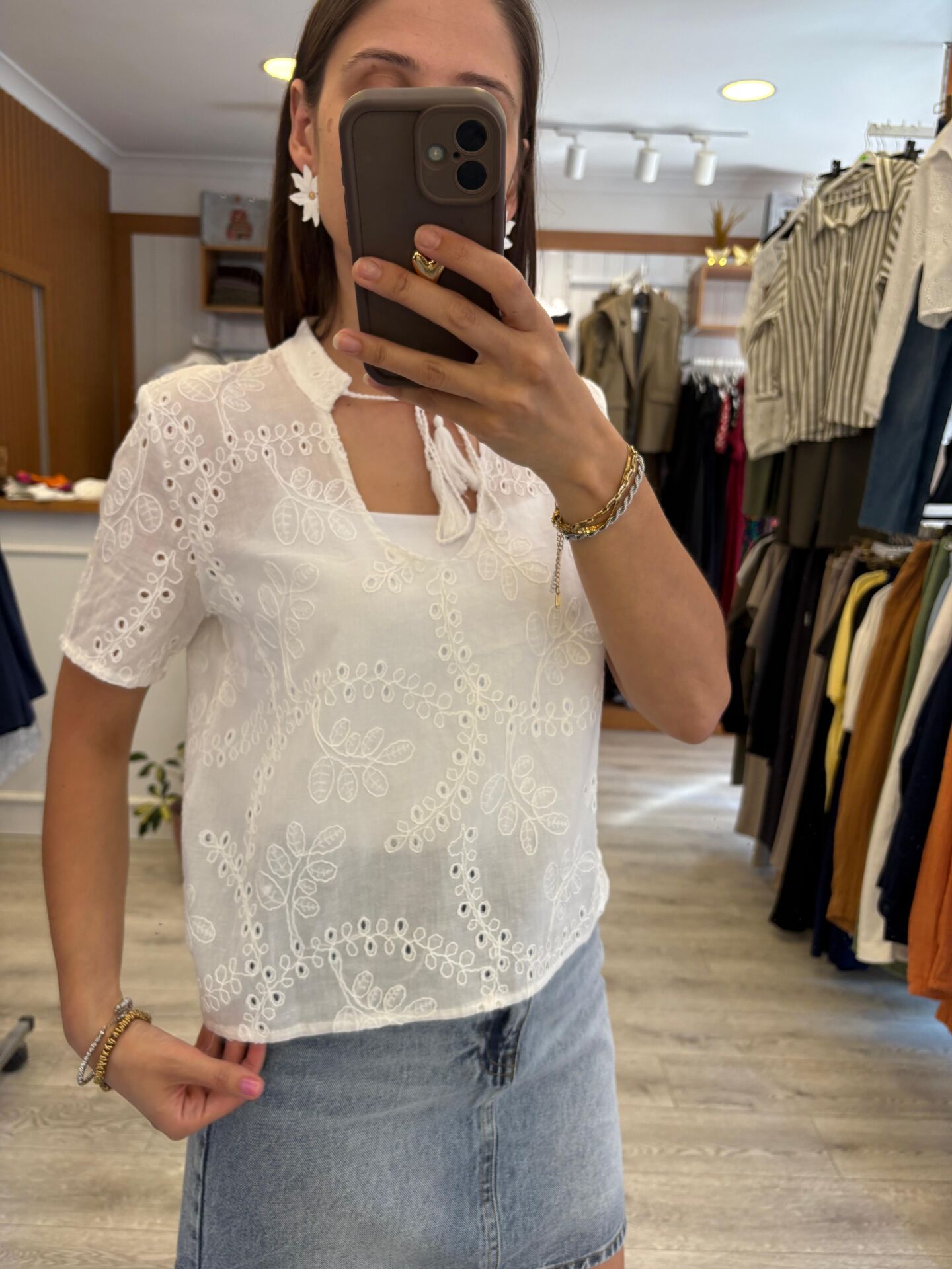 Yakası Bağlamalı Kısa Kollu Brodeli Bluz